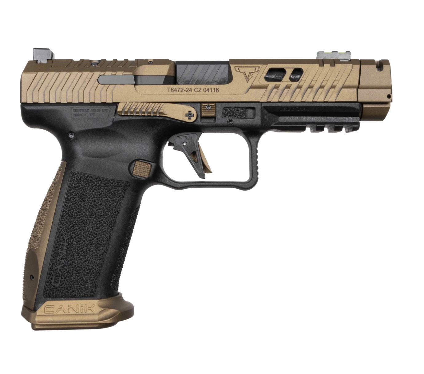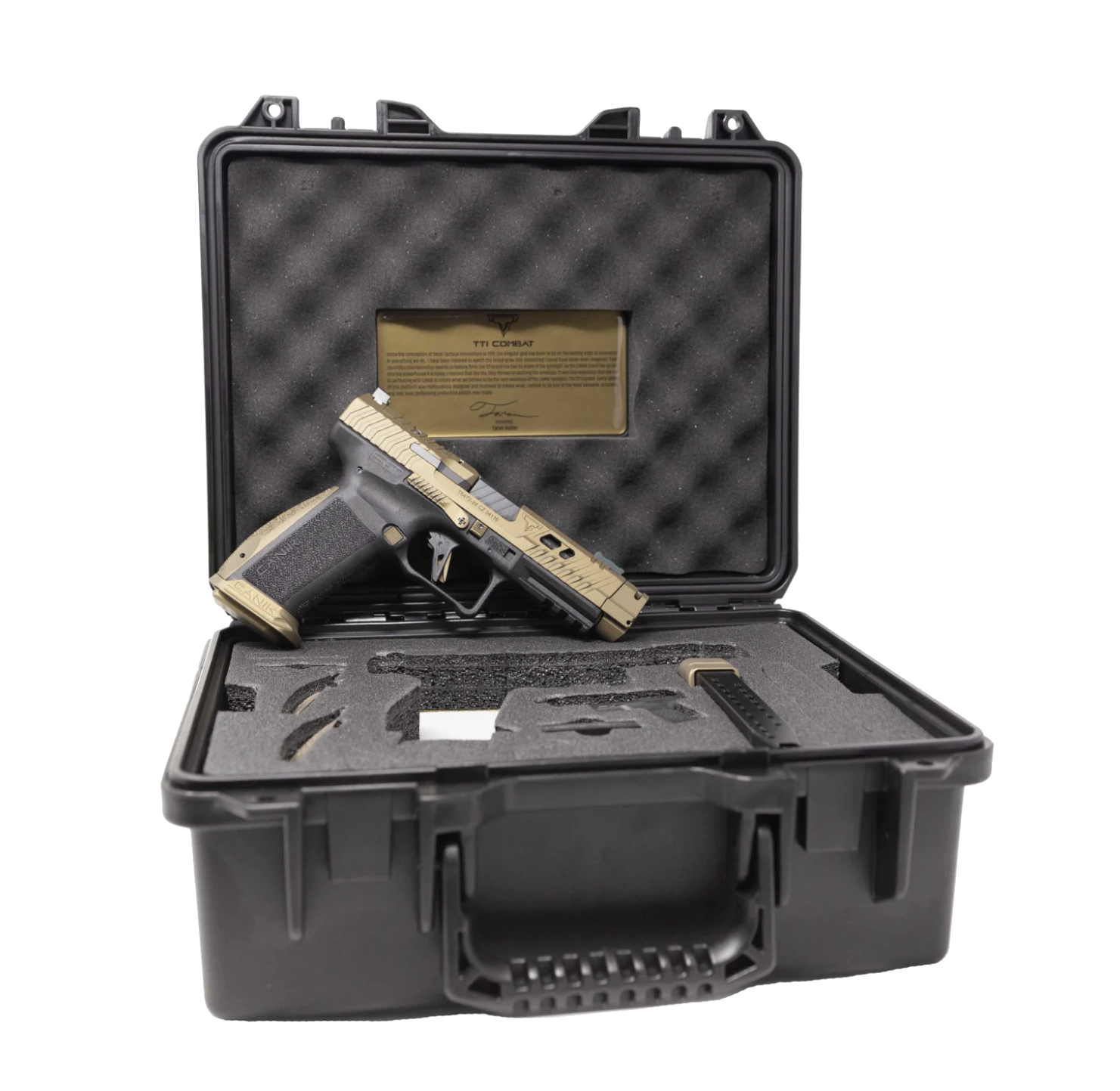 Taran Tactical Innovations and CANiK are proud to partner to bring you the CANiK TTI Combat. Built on a completely new polymer frame designed by Taran Butler, the TTI Combat brings a one-of-a-kind performance package to the CANiK lineup. This sleek design is built by the best, for the best, and includes all the features a world champion like Taran Butler needs for success. Both internally and externally, the TTI Combat delivers. Immediately notable are the following features: The aggressive grip texturing, integrated flared magwell, removable aluminum competition magwell, a ported and spiral-fluted barrel, the first CANiK compensator, a diamond cut and flat-faced 90 degree break trigger, fully adjustable sights, two 18 round magazines with one flush fit TTI base pad and one +3 TTI base pad, a serrated and ambidextrous slide release, three back strap size options, a low profile optics cut for the MECANIK line of optics as well as the Trijicon SRO… and many other optic options. This unique handgun also comes with a custom holster, hard travel case, cleaning kit, tool kit, custom punch, magazine speed loader, trigger lock and three optic plate interfaces. To finish off this collectable package we’ve included a handsome collaboration coin to commemorate our lasting partnership, a partnership that has created a truly Superior Firearm.